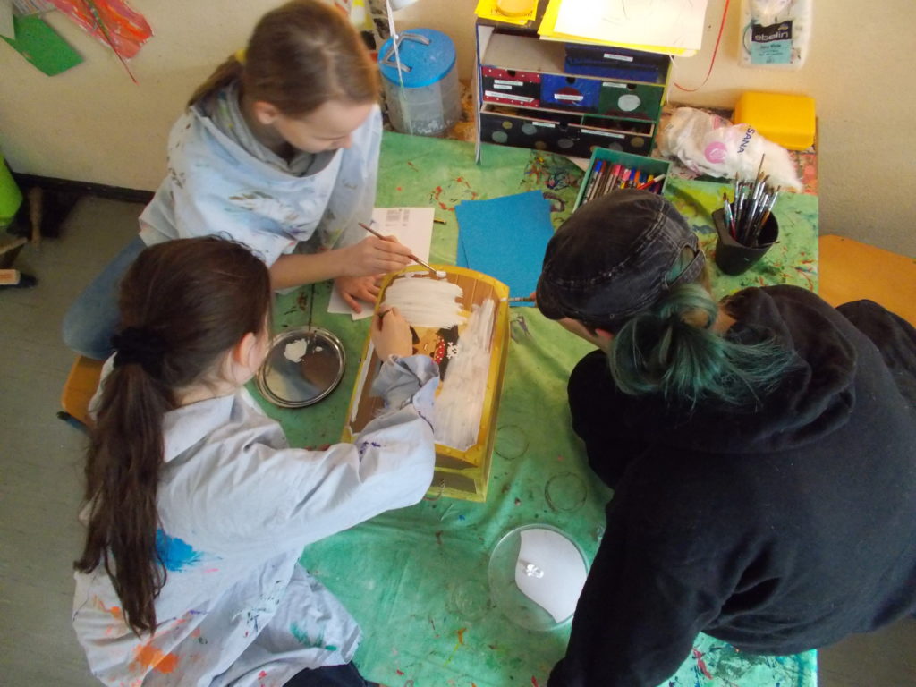 Darüber hinaus haben sie in einer “Truhe für fast alles” mit den Kindern darüber nachgedacht, was sie beschäftigt und Platz in der Truhe findet: Sorgen, Spiele, Kummer, Freude, Noten, Lesen, Mobbing. Ein Kind beschrieb dies folgendermaßen: “Also eigentlich alles, egal ob von zu Hause, der Schule oder der MiBe. Nur nicht sowas wie, wenn man will dass es Schulfrei gibt. Also keinen Unsinn.” Die Kiste, so wurde von den Kindern beschlossen, wird nur von den Betreuenden geöffnet, um einfache Sachverhalte an einer Tafel zu klären. Wiederum andere Inhalte werden in Einzelgesprächen mit dem einreichenden Kind besprochen oder werden in die neu geschaffenen demokratische Prozessen – der sogenannten Vollversammlung – bearbeitet.