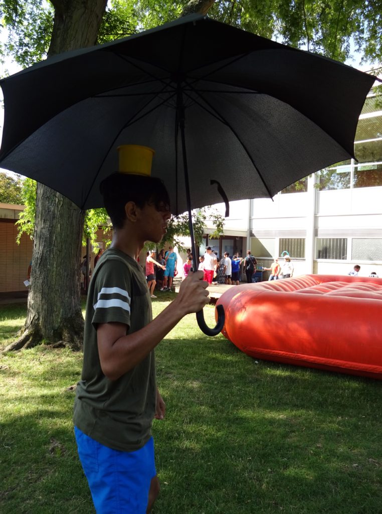 Bei über 30 Grad fand das von der Jugendhilfe angebotene Balancierspiel begeisterte Anhänger*innen: Ein mit Wasser gefülltes Gefäß wird auf dem Kopf über einen kleinen Parcours getragen, dabei ist die Abkühlung mitinbegriffen.