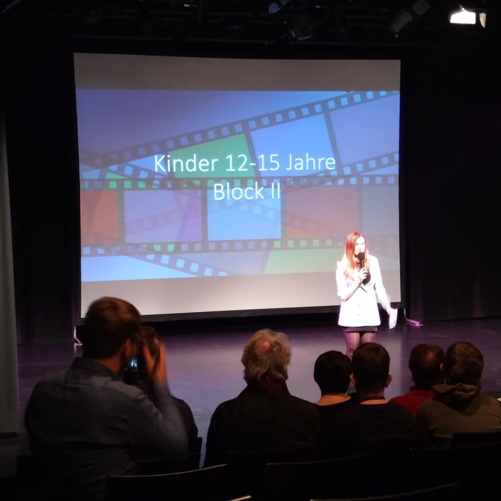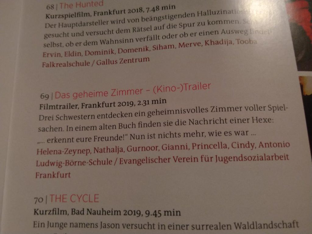 Am Sonntag Nachmittag wurde “Das geheime Zimmer” im zweiten Block (Alterskategorie ’12. bis 15. Jährige’) gezeigt und erhielt viel Applaus, obwohl der Filmbeitrag als Trailer und Teaser eher zu den kürzeren Beiträgen gehörte. Nachdem der Film im großen Saal des Gallus Theaters gezeigt wurde, beantwortete Stefanie Zellmann gemeinsam mit einem der jungen Filmemacher des Projektteams die Fragen aus dem Publikum. Das ganze Filmteam, das im Vorfeld und in der Nachbearbeitung viel Zeit und Arbeit in den mysteriösen und spannenden Thriller-Trailer steckte, ist aber viel größer als man denkt: Helena-Zeynep, Nathalja, Gurnoor, Gianni, Princella, Cindy, Antonio und Gurnoor sind alle Schüler*innen, die in diesem Jahr mit dabei waren, einen tollen Film auf die Beine zu stellen. Auch wenn “Das geheime Zimmer” am Abend des 1.12.2019 nicht prämiert wurde, freute sich die gesamte Gruppe, an der Visionale teilgenommen zu haben. Auch im nächsten Jahr möchte die Jugendhilfe einen Film konzipieren und zum Start der Visionale 2020 mit dabei sein!