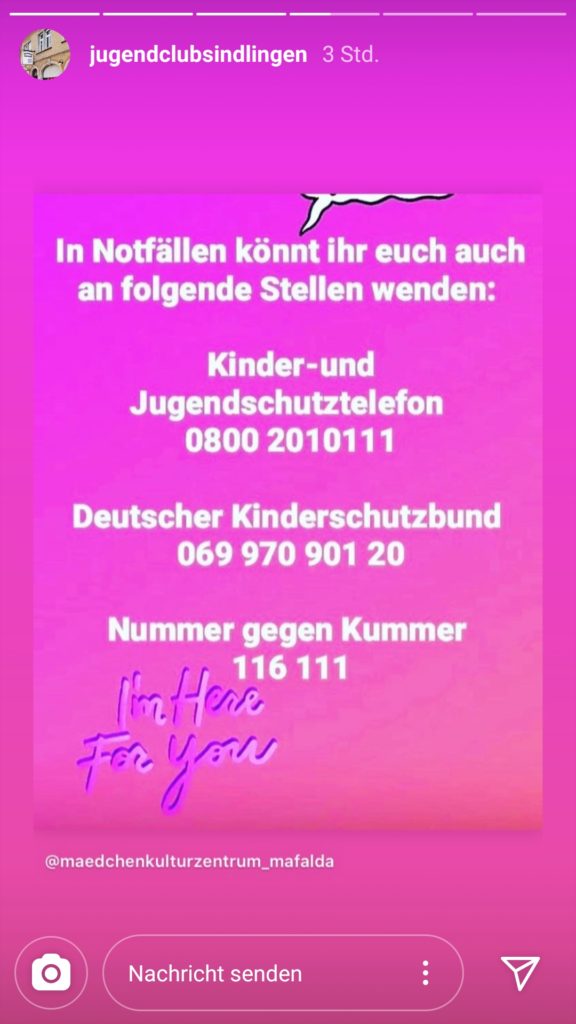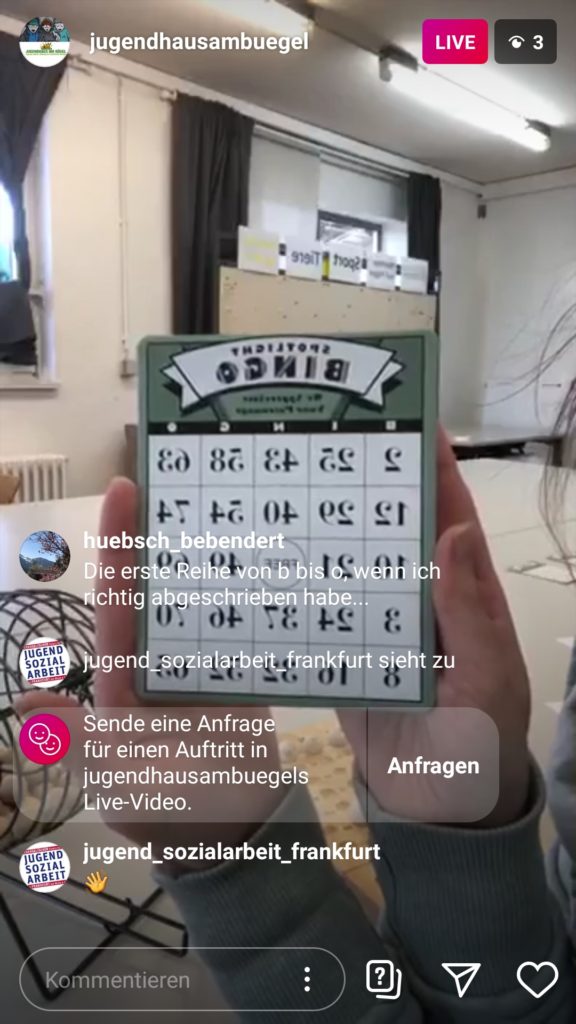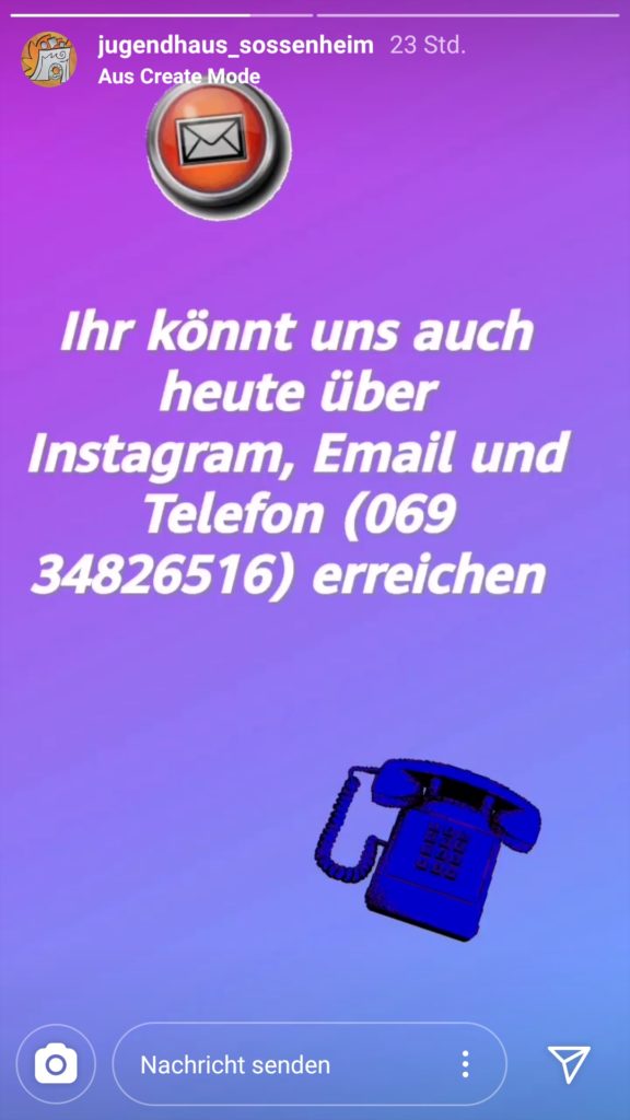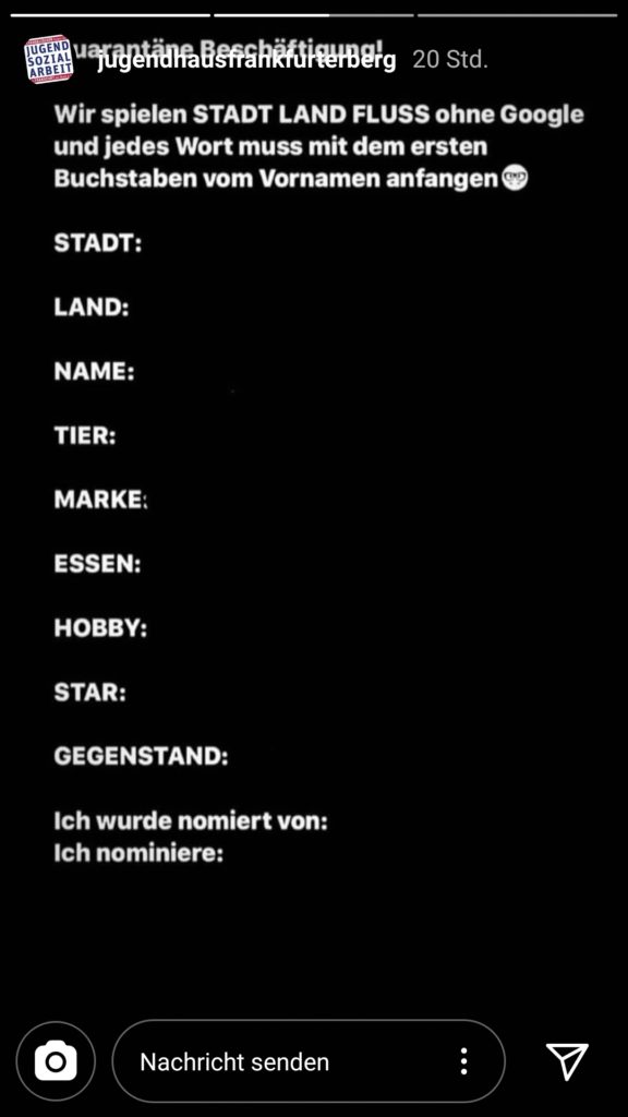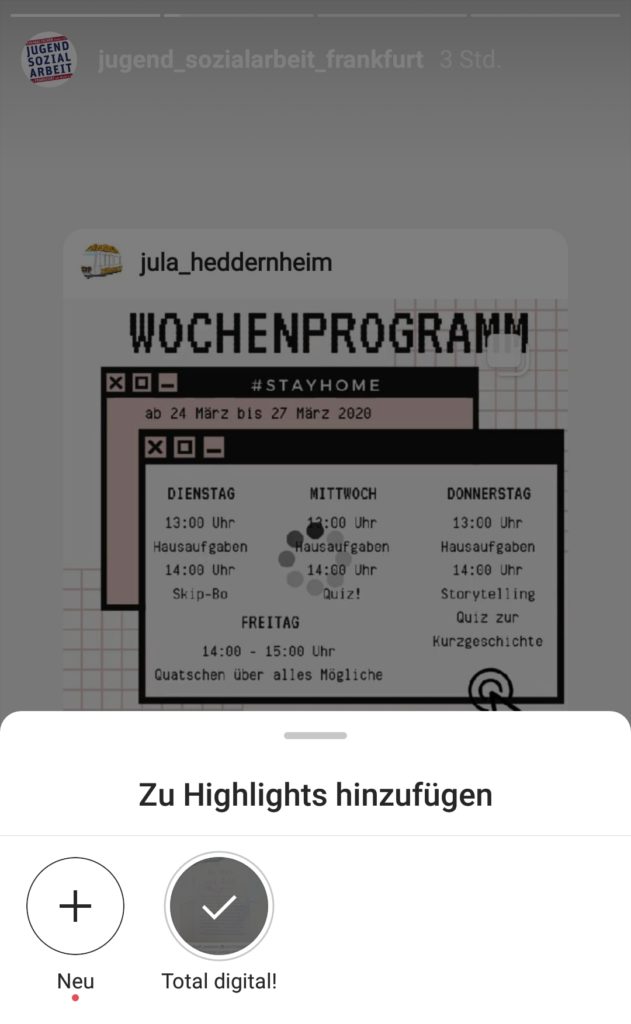 Auf Instagram und auch Facebook haben wir unter dem Namen “jugend_sozialarbeit_frankfurt” ein Highlight eingerichtet, das sich “total digital” nennt und unsere Online-Angebote zeigt.
