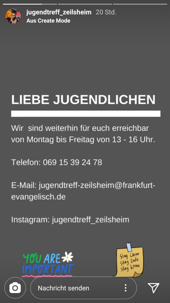 Im Zuge der aktuellen Entwicklungen, mussten wir leider alle Kinder- und Jugendeinrichtungen, Schulkinderbetreuungen und Projekte schließen, um die Ansteckungsgefahr mit COVID-19 (Corona) zu minimieren. “Physical distancing” nennt sich diese Form der Vermeidung der Ansteckung, damit versuchen wir uns gegenseitig zu schützen, indem wir Distanz wahren. Gerade jetzt, wenn alle Routinen einbrechen und wir einen neuen Alltag schaffen müssen, brauchen wir uns jedoch gegenseitig. Dem Evangelischen Verein für Jugendsozialarbeit in Frankfurt am Main e.V. und allen Mitarbeiter*innen ist es wichtig, zu zeigen, dass wir trotz dieser krisenhaften Situation DA sind. Wir sind da, nur anders, das heißt wir haben bereits Online-Angebote in unterschiedlichen Formaten etabliert und entwickeln ständig weitere. Entsprechend der aktuellen, größtenteils ungewissen Situation, müssen wir alle zu neuen Formaten greifen. Noch nie zuvor waren soziale Medien so relevant wie heute, denn so können wir unseren Besucher*innen, Adressat*innen und allen anderen jungen Menschen weiterhin zeigen, dass wir für sie da sind und das bestmöglich ohne physischen Kontakt!